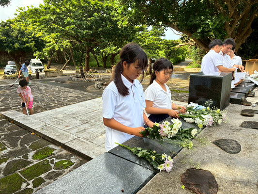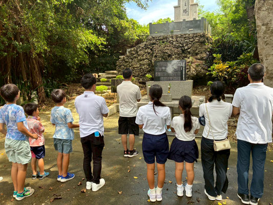 清掃、慰霊祭の斎行後は、白梅之塔など三か所の慰霊塔を訪れて哀悼を捧げ、午後からは鍾乳洞の散策や首里城の見学、沖縄県護国神社を参拝しました。